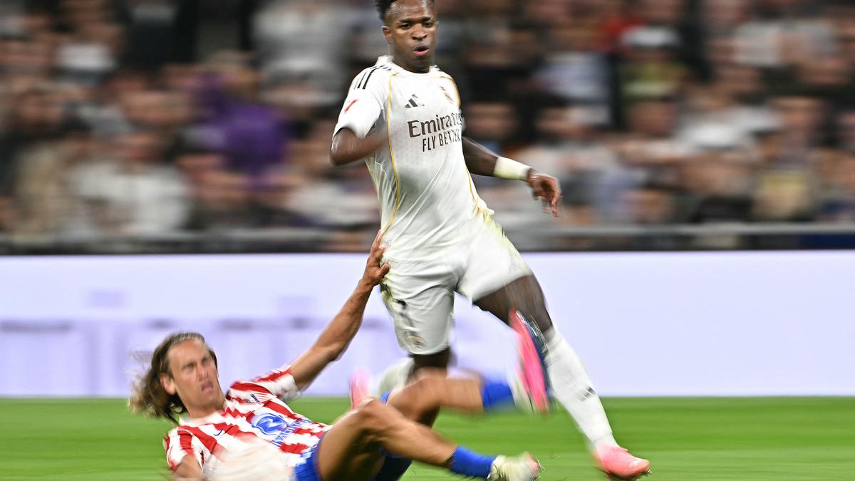 Atletico Madrid’s Spanish midfielder #14 Marcos Llorente (L) and Real Madrid’s Brazilian forward #07 Vinicius Junior fight for the ball during the Spanish league football match between Real Madrid CF and Club Atletico de Madrid at Santiago Bernabeu Stadium in Madrid on March 22, 2026. | Photo Credit: AFP Vinicius Jr scored twice as Real Madrid fought back to beat visitors Atletico Madrid 3-2 in a breathless Spanish capital derby on Sunday, keeping Alvaro Arbeloa’s side within four points of LaLiga leaders Barcelona. Billed as a relatively low-key Madrid derby, with Atletico sitting a distant fourth in the table, the match instead delivered a five-goal spectacle between the rivals. It had everything — stunning goals from both sides and a straight red card to Real captain Federico Valverde that reduced the hosts to 10 men in the dying minutes. Atletico’s Ademola Lookman opened the scoring in the 33rd minute, finishing a slick counter-attack involving Matteo Ruggeri and a delightful backheel from Giuliano Simeone. Vinicius equalised from the penalty spot in the 52nd minute after David Hancko clumsily tripped Brahim Diaz, and Valverde capitalised on a Jose Maria Gimenez error three minutes later to make it 2-1 to Real. Nahuel Molina silenced Real’s Bernabeu stadium with a thunderous 30-metre strike in the 66th minute, but Vinicius restored Real’s lead with a cracking solo effort six minutes later. Valverde then saw red for an inexplicable challenge on Alex Baena, and Julian Alvarez struck the post as Atletico pressed, but Real held firm. “In control from the start” “Real Madrid always come out on top,” Vinicius told Real Madrid TV. “I’m very pleased with the performance we put in today. We were in control from the start; we conceded a goal, but we kept our cool and did what we had to do so our fans could go home happy with another win.” Atletico’s disappointing league campaign contrasts starkly with their Copa del Rey form, where they will face Real Sociedad in next month’s final after knocking Barcelona out in the semis. They also face Barca in the Champions League quarter-finals in a fortnight, after the international break. They gave Real a proper fight, pressing until the final whistle of a hugely entertaining contest. Real almost took the lead inside three minutes when Vinicius made a fabulous solo run from the left and was denied by a great save from Juan Musso, while Valverde hit the post after another fantastic run a few minutes later. Giuliano Simeone made a selfless goal-line clearance to deny Vinicius from point-blank range inside the six-yard box in the 20th minute, blocking the Brazilian’s effort twice. Real pay for wastefulness Real paid dearly for their wastefulness when Atletico opened the scoring through Lookman’s counter in the 33rd minute. Yet they found the equaliser seven minutes after the restart when Hancko lost his balance trying to dispossess Brahim inside the area, clumsily tripping the Moroccan to gift the hosts a penalty. Vinicius blasted it home to his left as Musso dived the wrong way. Three minutes later Valverde gave Real the lead after a schoolboy error from centre back Gimenez, introduced at halftime to shore up the defence. The Uruguayan failed to deal with a routine pass, allowing Valverde to pounce on the loose ball, wrestle past the flailing defender and fire past Musso. Just as Real appeared in full control, Atletico conjured an equaliser from nothing in the 66th minute. Right back Molina tried his luck from 30 metres and sent a thunderous strike arrowing into the top-left corner. Vinicius took matters into his own hands six minutes later, cutting in diagonally from the left, dribbling past two opponents and unleashing an unstoppable shot just inside the far post. Then came a bewildering twist when Valverde was flashed a straight red, but Real held firm to claim all three points. Published – March 24, 2026 01:48 am IST Share this: Click to share on WhatsApp (Opens in new window) WhatsApp Click to share on Facebook (Opens in new window) Facebook Click to share on Threads (Opens in new window) Threads Click to share on X (Opens in new window) X Click to share on Telegram (Opens in new window) Telegram Click to share on LinkedIn (Opens in new window) LinkedIn Click to share on Pinterest (Opens in new window) Pinterest Click to email a link to a friend (Opens in new window) Email More Click to print (Opens in new window) Print Click to share on Reddit (Opens in new window) Reddit Click to share on Tumblr (Opens in new window) Tumblr Click to share on Pocket (Opens in new window) Pocket Click to share on Mastodon (Opens in new window) Mastodon Click to share on Nextdoor (Opens in new window) Nextdoor Click to share on Bluesky (Opens in new window) Bluesky Like this:Like Loading... Post navigation Election observers deployed in Thoothukudi; field inspection begins Puducherry Independent MLA representing Thirubhuvanai joins DMK