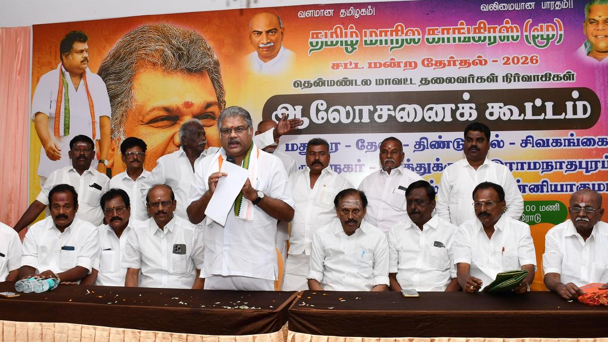 TMC chief G.K. Vasan addresses functionaries at the consultative meeting held in Madurai on Saturday