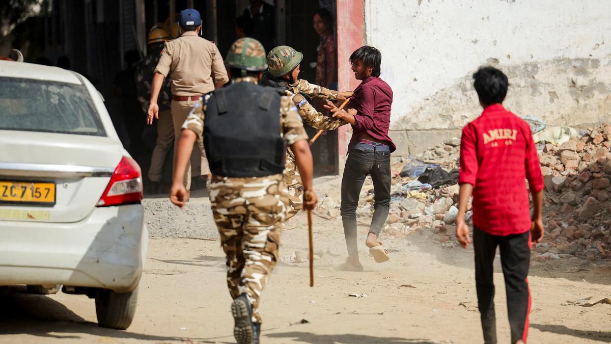 A policeman hits a man in a migrant neighbourhood near Dixon Electro Appliances Private Limited factory, after violent protests by factory workers demanding wage hikes, in Noida, on April 14, 2026.