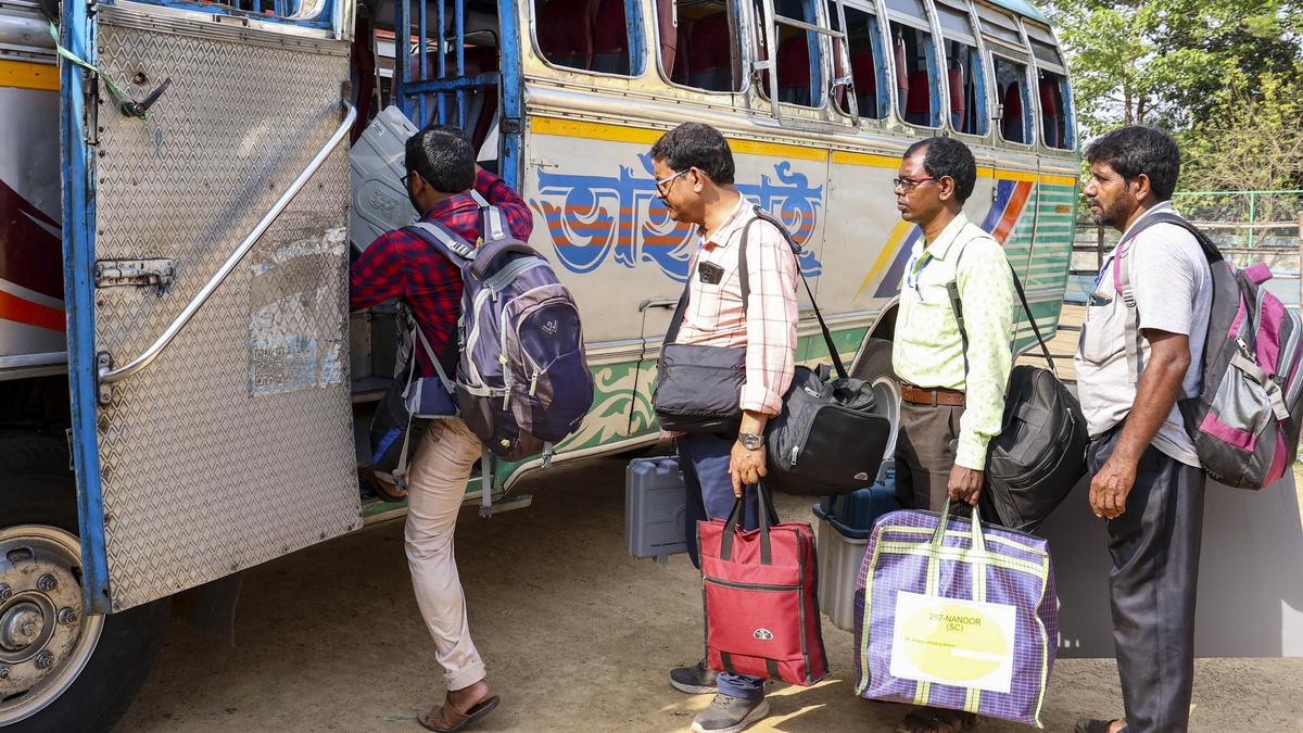 Polling officials carry electoral material as they board a bus for their respective polling stations from a distribution centre, ahead of the West Bengal Assembly elections, in Birbhum distric on April 22, 2026 | Photo Credit: PTI One hundred and fifty-two assembly seats spread across 16 districts of West Bengal will go to polls in the first phase of the elections on Thursday (April 23, 2026). About 3.6 crore electors will determine the fate of 1,478 candidates in the fray across these 152 seats. Eight of the districts going to elections are in north Bengal and eight in south Bengal. The Election Commission of India has deployed a record number of about 2,407 companies of the Central Armed Police Forces for the first phase of polling. On Wednesday, as polling personnel across the 16 districts collected polling materials, including EVMs, and reached polling venues, the political parties continued to trade charges. Published – April 23, 2026 02:00 am IST Share this: Click to share on WhatsApp (Opens in new window) WhatsApp Click to share on Facebook (Opens in new window) Facebook Click to share on Threads (Opens in new window) Threads Click to share on X (Opens in new window) X Click to share on Telegram (Opens in new window) Telegram Click to share on LinkedIn (Opens in new window) LinkedIn Click to share on Pinterest (Opens in new window) Pinterest Click to email a link to a friend (Opens in new window) Email More Click to print (Opens in new window) Print Click to share on Reddit (Opens in new window) Reddit Click to share on Tumblr (Opens in new window) Tumblr Click to share on Pocket (Opens in new window) Pocket Click to share on Mastodon (Opens in new window) Mastodon Click to share on Nextdoor (Opens in new window) Nextdoor Click to share on Bluesky (Opens in new window) Bluesky Like this:Like Loading... Post navigation ‘The Pitt’ Season 2 review: Sanctimonious heroics nearly derail a a clinically sharp second shift From The Hindu Archives, April 23, 1926: Medical facilities at Nandi Hills