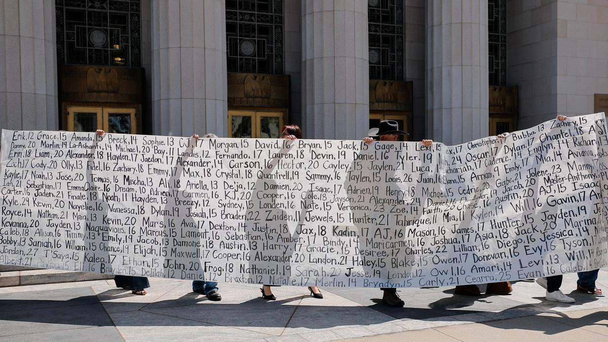 Parents display a banner bearing the names of children lost to social media harm outside a Los Angeles court, after a jury held Meta and YouTube liable in a landmark case over platforms and their impact on children’s mental health on March 25