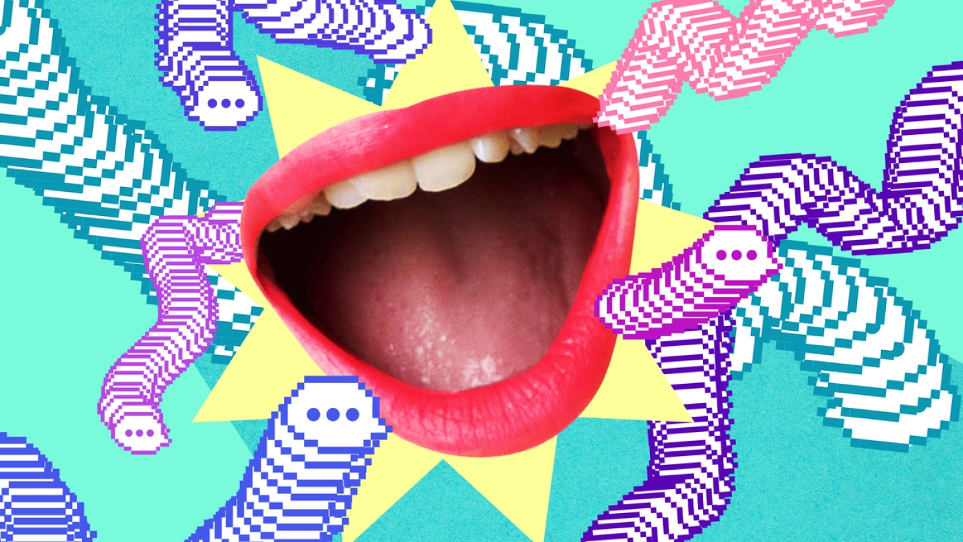Cutout of woman's mouth surrounded by instant message speech bubbles on green background
