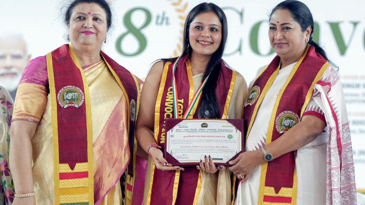 Delhi Chief Minister Rekha Gupta presents a degree and medal to a student during the 8th Convocation Ceremony of Indira Gandhi Delhi Technical University for Women in New Delhi on Thursday.