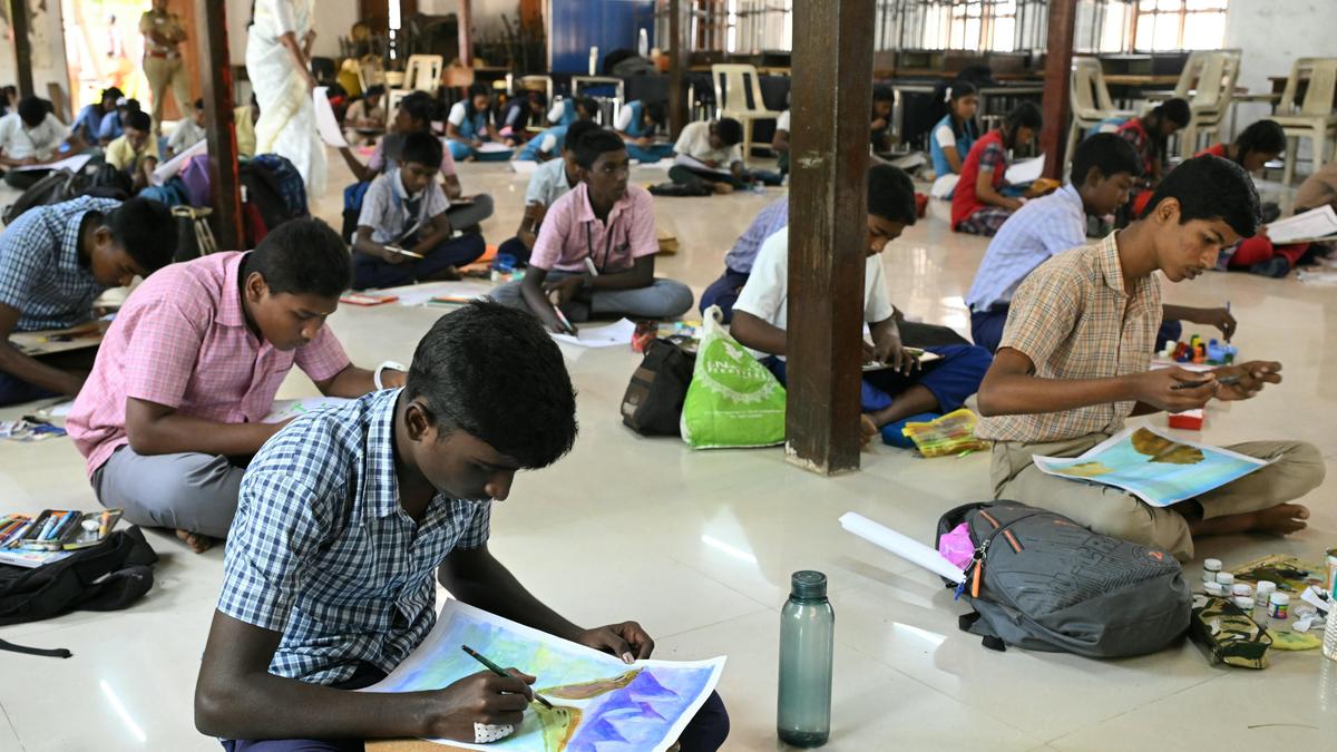 Students participate in the drawing competition organised by the Forest Department in Thoothukudi on Thursday.